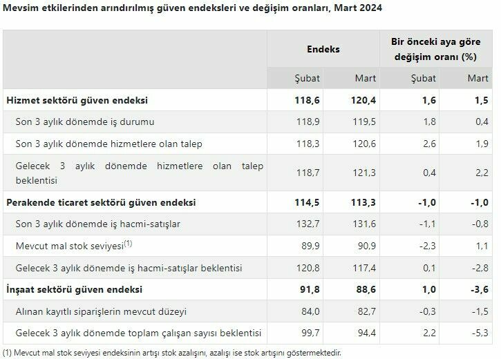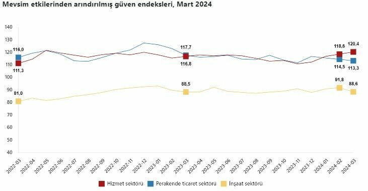 Mevsim etkilerinden arındırılmış güven endeksi değerlerine göre, Mart ayında hizmet sektöründe %1,5 oranında bir artış gözlendi. Hizmet sektörü güven endeksi 120,4 değerine yükseldi. Ancak, aynı dönemde perakende ticaret sektöründe %1,0 azalış yaşandı ve güven endeksi 113,3'e geriledi. İnşaat sektöründe ise %3,6'lık bir düşüş kaydedilerek güven endeksi 88,6 olarak belirlendi.