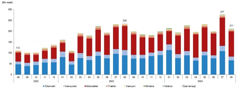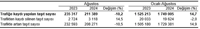 Ağustos 2023'e kıyasla bu yılın aynı ayında trafiğe kaydı yapılan taşıt sayısı %10,2 oranında azaldı. Otobüs ve minibüs gibi taşıtlarda artış yaşanırken, otomobil ve kamyonet gibi araç türlerinde belirgin bir düşüş görüldü. Otobüs kayıtları %32,4, minibüs %28,7 ve motosiklet kayıtları %5,7 artarken, otomobilde %26,2, kamyonette %26,2, traktörde %13,1 ve kamyonda %3,5 azalma oldu.