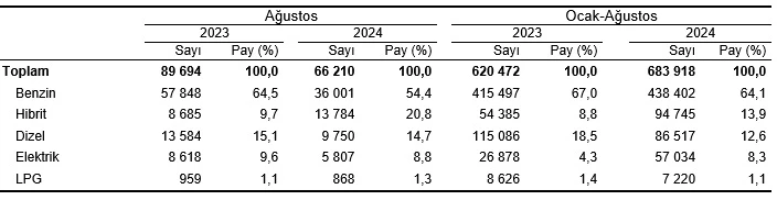Ocak-Ağustos döneminde trafiğe kaydı yapılan 683 bin 918 adet otomobilin %64,1’i benzin, %13,9’u hibrit, %12,6’sı dizel ve %8,3’ü elektrikli motor özelliklerine sahip. Ağustos sonu itibarıyla trafikteki 15 milyon 901 bin 404 otomobilin %34,7’si dizel, %32,4’ü LPG, %29,9’u benzin ve %2,0’si hibrit araçlardan oluşuyor.