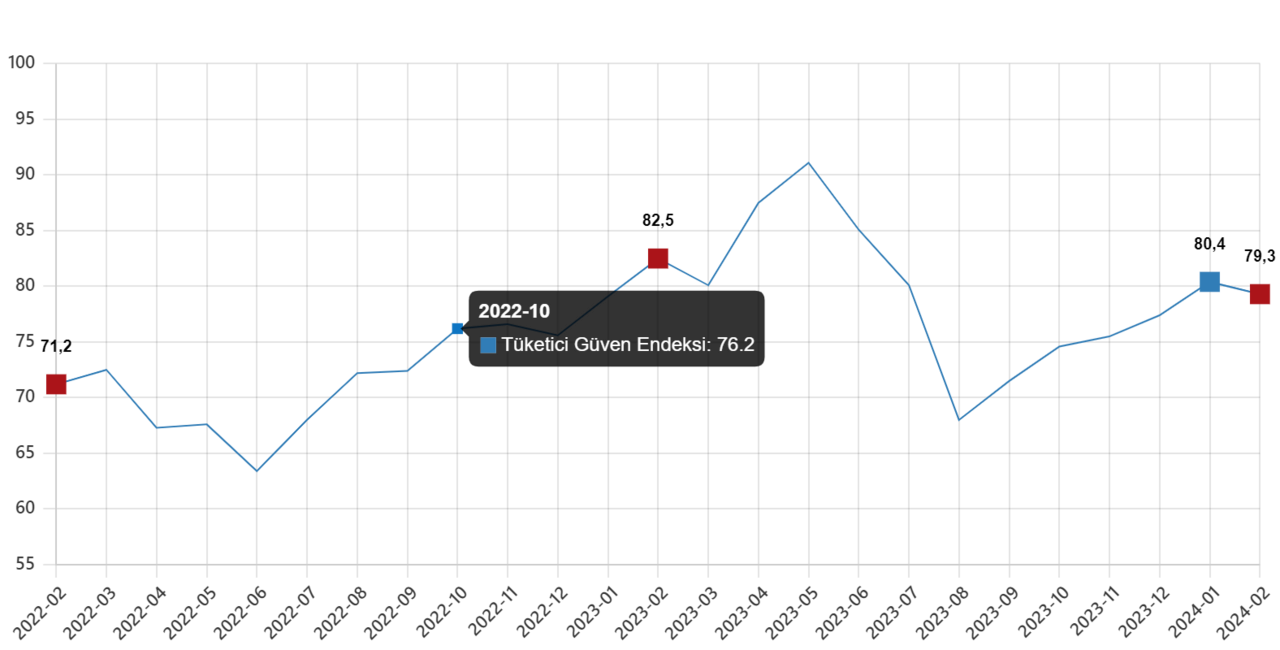 Türkiye İstatistik Kurumu ve Türkiye Cumhuriyet Merkez Bankası'nın işbirliğiyle yürütülen tüketici eğilim anketi sonuçlarından elde edilen verilere göre, tüketici güven endeksi Ocak ayındaki 80,4 seviyesinden, Şubat ayında %1,3'lük bir azalışla 79,3'e geriledi.