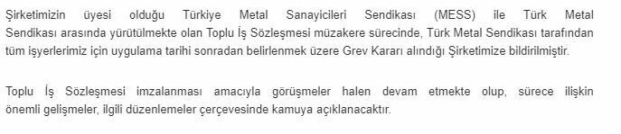 Şirketin KAP açıklamasında kullanılan ifadeler şu şekildedir: "Toplu iş sözleşmesi görüşmeleri devam etmekte olup, Türk Metal Sendikası'nın tüm iş yerlerimizde aldığı grev kararı hakkında gelişmeler kamuoyu ile zamanında paylaşılacaktır."