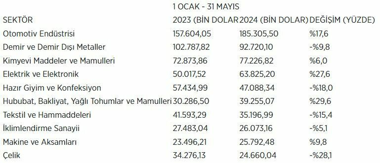 TİM sistemlerine göre, Çekya'ya, ocak-mayıs döneminde sektörlerin gerçekleştirdiği ihracat miktarları (bin dolar) ve geçen yılın aynı günlerine göre değişim oranları şöyle: