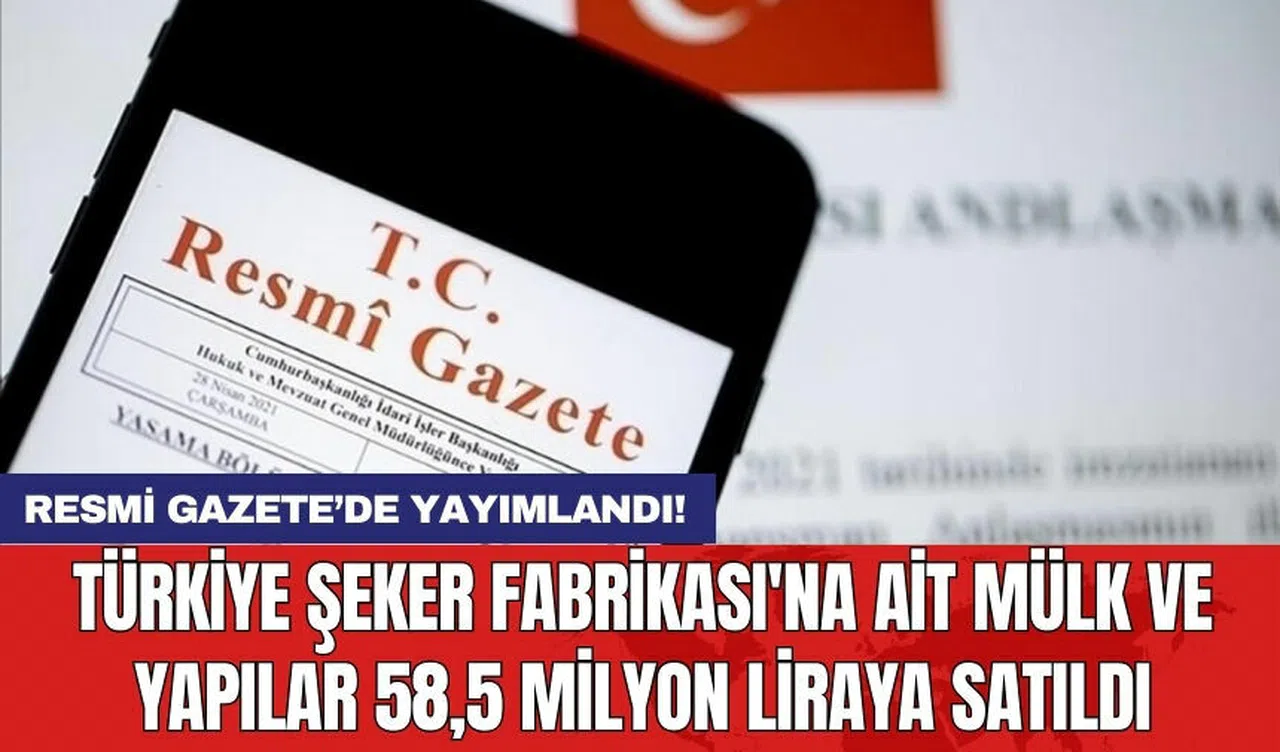 Bursa'nın Karacabey ilçesindeki Türkiye Şeker Fabrikası'na ait mülkiyeti bulunan taşınmazlar ile üzerlerinde yer alan yapılar, 58 milyon 500 bin lira bedelle satıldı. Bu karar, Özelleştirme Dairesi Başkanlığı tarafından alındı ve Resmi Gazete'de yayımlandı.