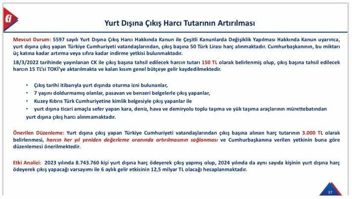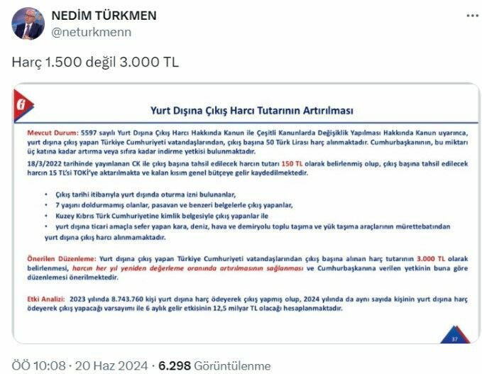 Nedim Türkmen'in iddiasına göre, yeni vergi paketi kapsamında yurt dışı çıkış harcı 150 TL'den 1500 TL'ye değil, 3000 TL'ye çıkarılacak.