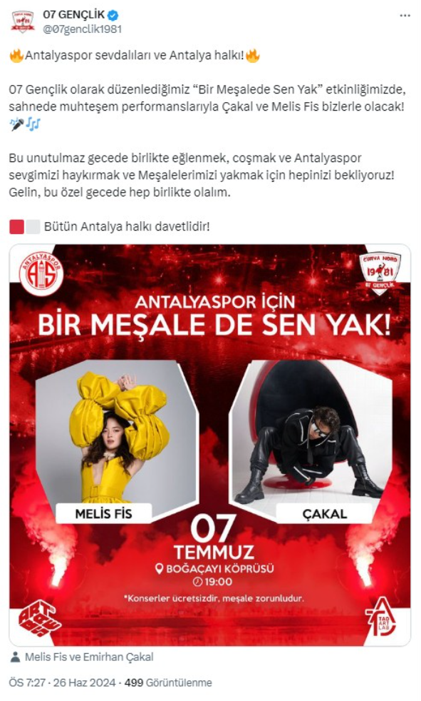 07 Gençlik, resmi sosyal medya hesaplarından yapmış olduğu açıklamada, 'Bir Meşale de Sen Yak' etkinliğine tüm Antalya halkını davet etti. Etkinlikte birlikte eğlenmek ve Antalyaspor sevgisini bir meşalede haykırmak için bütün herkesi beklediklerini belirttiler.