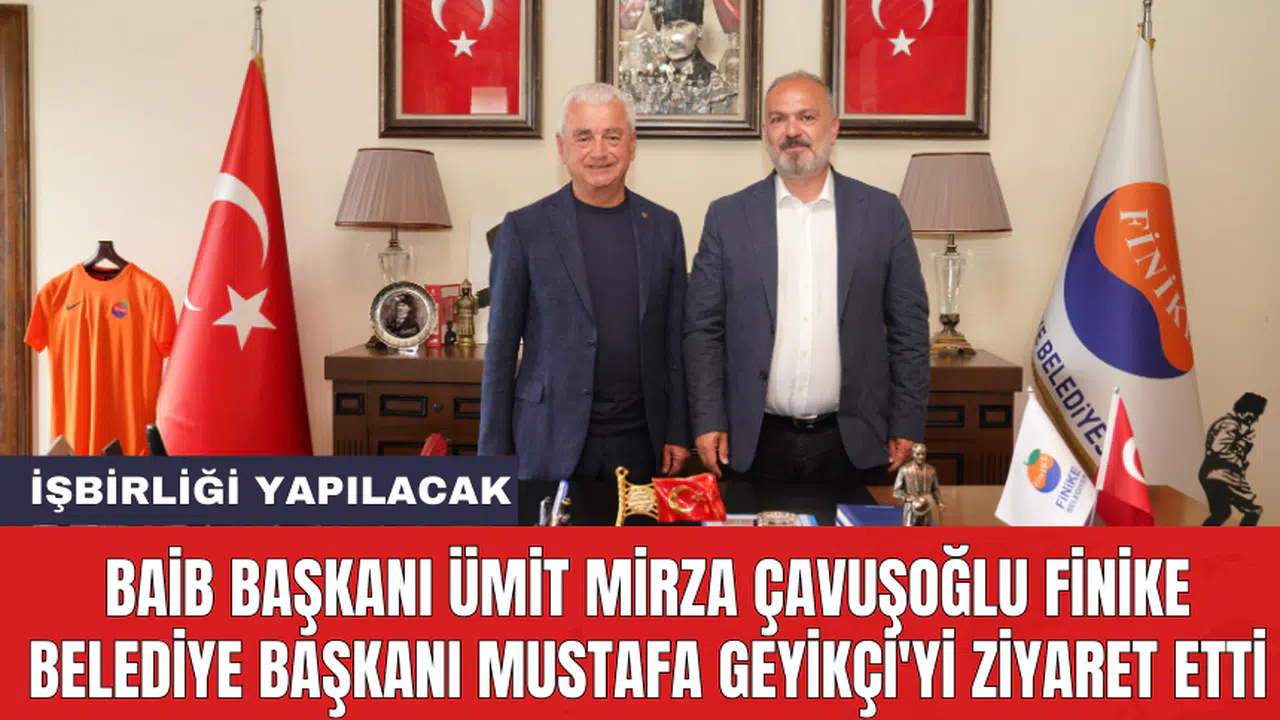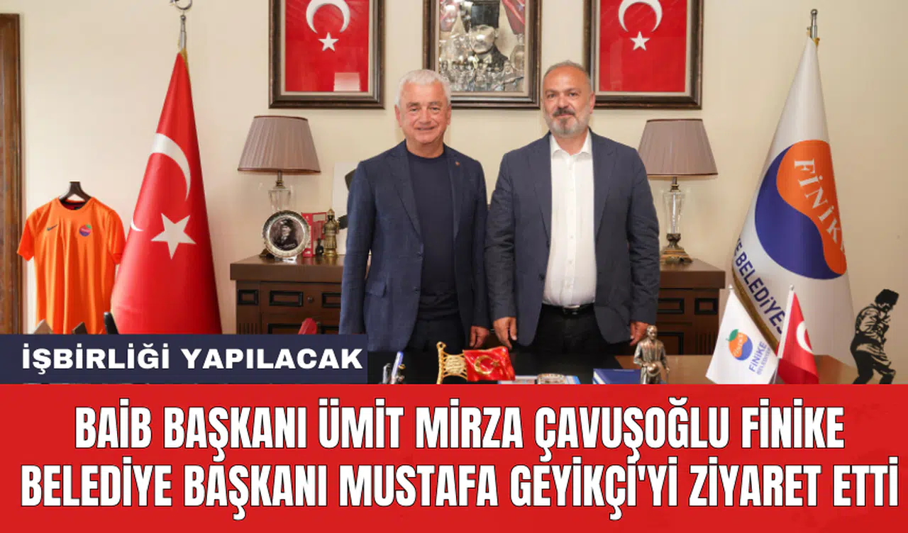 Batı Akdeniz İhracatçılar Birliği (BAİB) Yönetim Kurulu Başkanı Ümit Mirza Çavuşoğlu, Finike Belediye Başkanı Mustafa Geyikçi'yi ziyaret etti. Yerel seçimlerin ardından tekrar seçilen Başkan Geyikçi, Çavuşoğlu'nu ağırladı. Ziyarette, ilçe ve bölge ekonomisi üzerine görüş alışverişi yapıldı.
