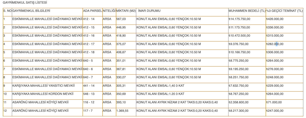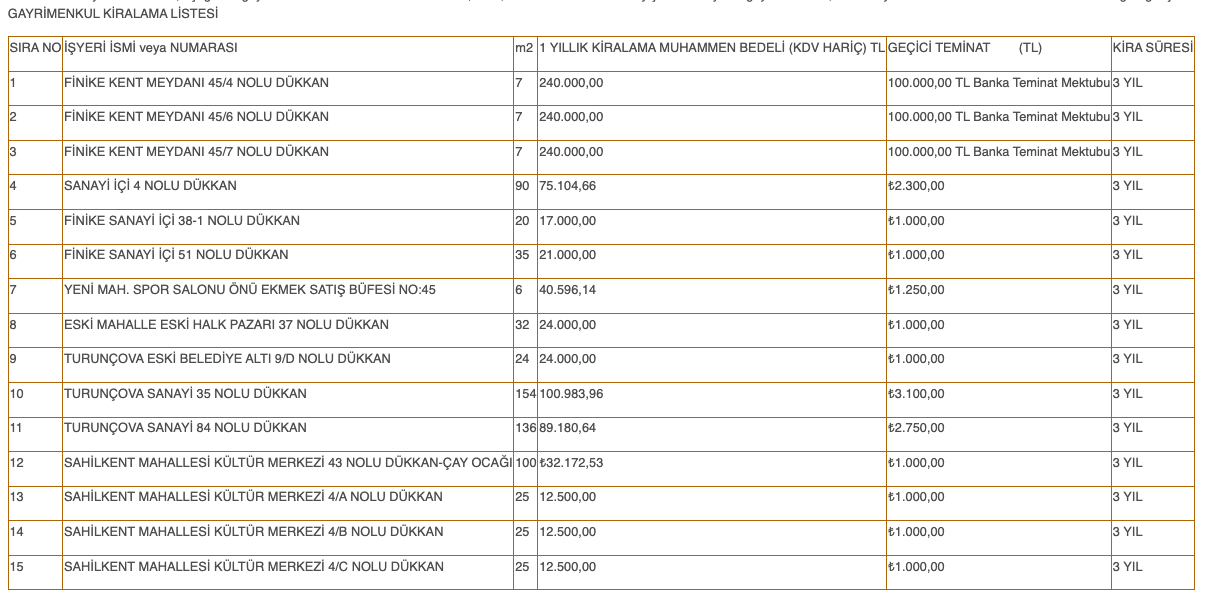 Son dönemlerde gittikçe artan ‘Tasarruf Tedbirleri’ adı altında başlayan program bir çok belediyenin borç yükünü de arttırdı. Belediyeler her geçen gün taşınmazlarını satarken bunun son örneği ise Finike Belediyesi’nden geldi. Finike Belediyesi, kendi mülkiyetinde bulunan 12 arsa ve 3 dükkanın toplam en az 122 milyon 63 bin 650 TL’den satışa çıkarırken 15 dükkanda kiralanacak. Arsa satışlarının 8 tanesi denize ve yat limanına yakın bir konumda bulunan Eskimahalle Mahallesi’nde olduğu görülürken, emsalleri yüksek olan 2 arsa Karşıyaka Mahallesi’nde satılacak. 2 arsa ise Asarönü Köyü’nde bulunuyor. Satılacak 3 dükkanın ise oto galericiler sitesinde olduğu ifade edildi. Kiralanması planlanan 15 dükkanın ise toplam aylık en az kira bedelinin 1 milyon 181 bin 535 TL olduğu görüldü. 3 dükkanın Finike Kent Meydanı’nda 7 metrekarelik alanlar olduğu görülürken, sanayi içinde 3, Yeni Mahalle Spor Salonu’nda 1, Eskimahalle halk pazarında 1, Turunçova da ikisi sanayide olmak üzere 3, Sahilkent Mahallesi’nde ise 4 dükkan kiralanacak.