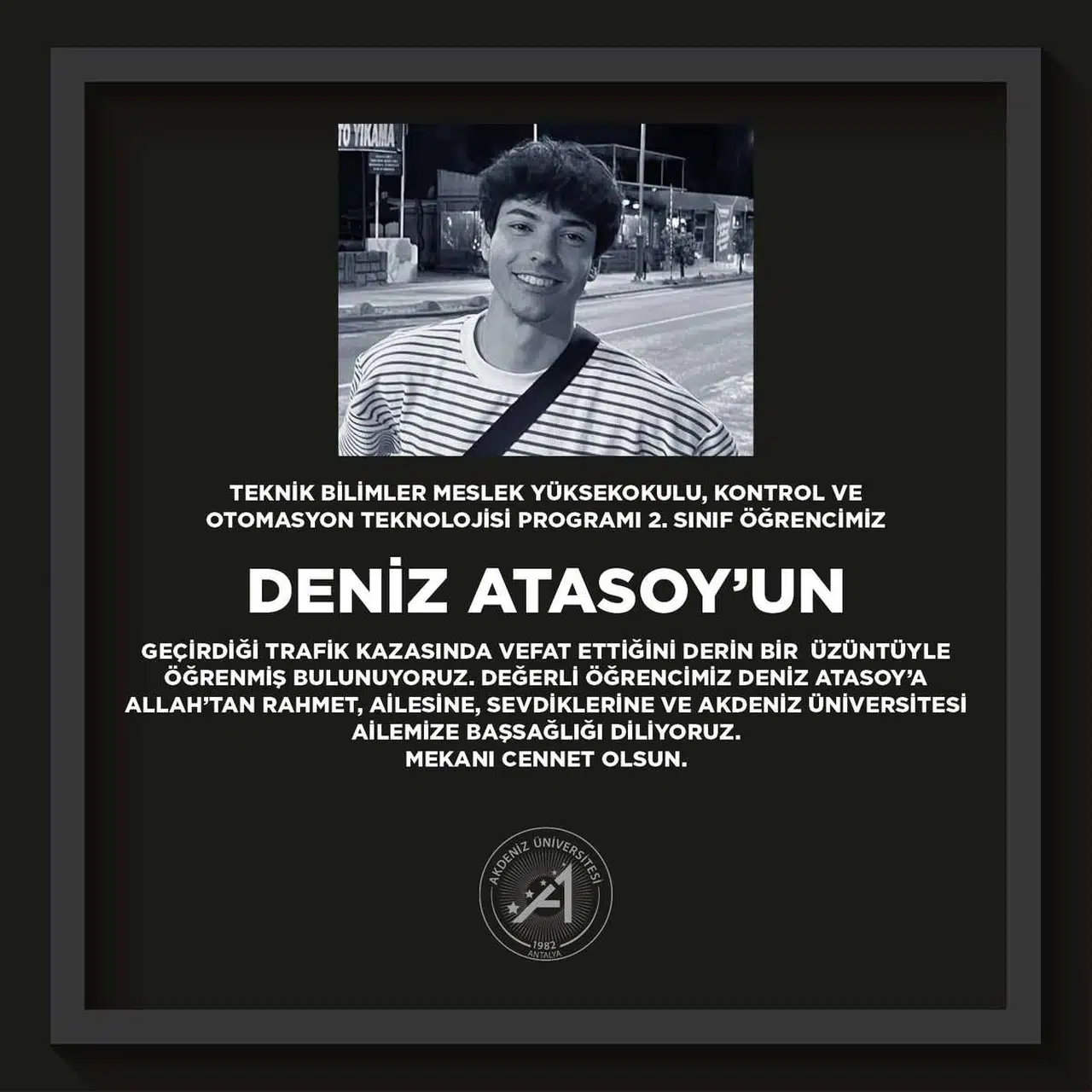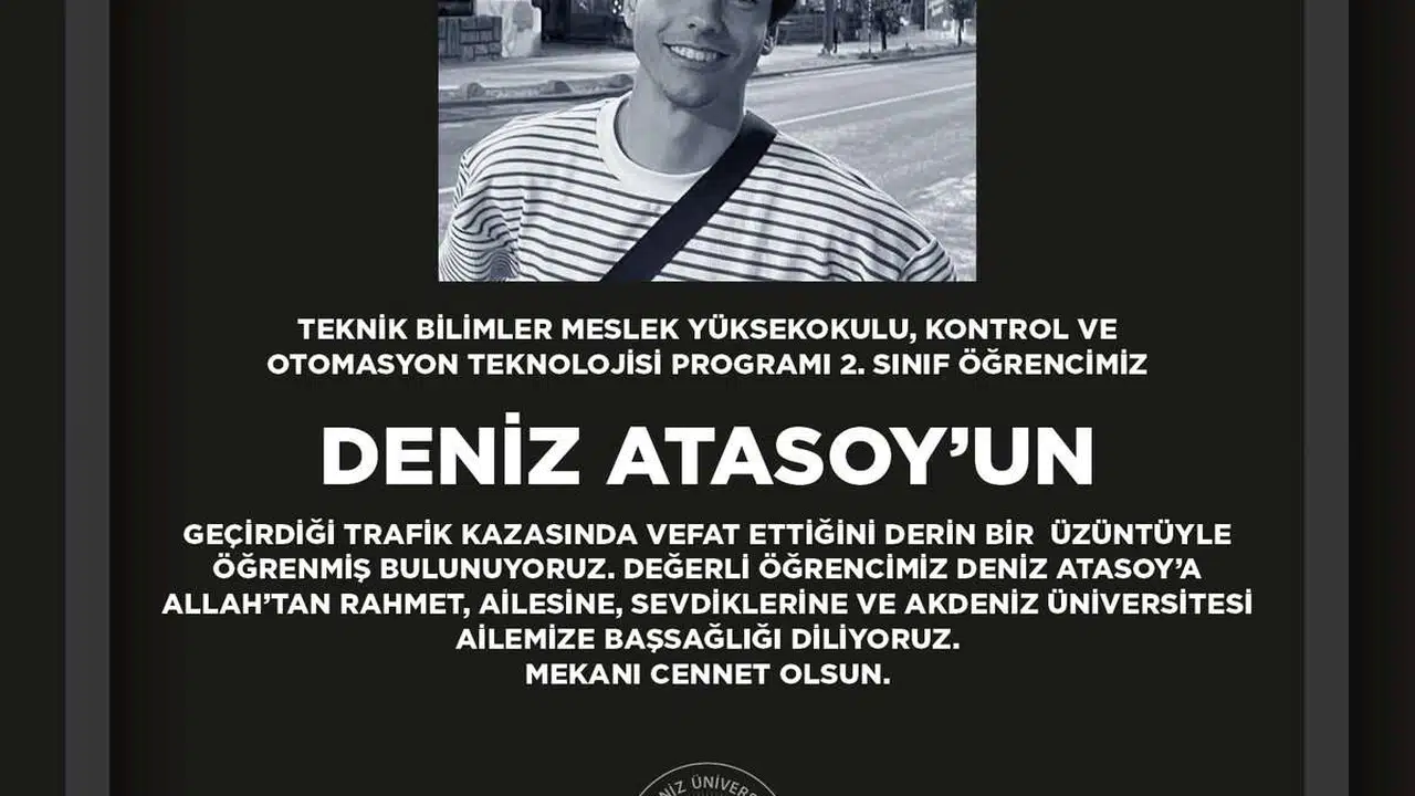 Akdeniz Üniversitesi'nden Taziye MesajıAcı haberin ardından Akdeniz Üniversitesi resmi bir taziye mesajı yayımladı. Üniversite yönetimi tarafından paylaşılan mesajda, Deniz Atasoy’un vefatından duyulan derin üzüntü dile getirildi. Açıklamada şu ifadelere yer verildi:"Teknik Bilimler Meslek Yüksekokulu, Kontrol ve Otomasyon Teknolojisi Programı 2. sınıf öğrencimiz Deniz Atasoy'un geçirdiği trafik kazasında vefat ettiğini derin bir üzüntüyle öğrenmiş bulunuyoruz. Değerli öğrencimiz Deniz Atasoy'a Allah'tan rahmet, ailesine, sevdiklerine ve Akdeniz Üniversitesi ailemize başsağlığı diliyoruz. Mekanı cennet olsun."