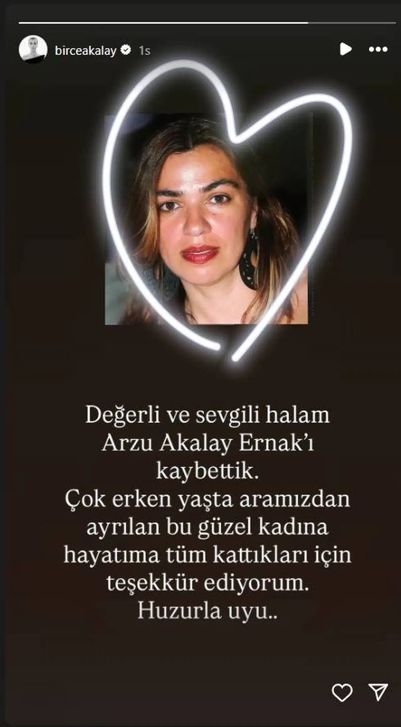 Birce Akalay, yaptığı paylaşımda halası Arzu Akalay Ernak’ın genç yaşta yaşamını yitirdiğini belirterek duygularını şu sözlerle dile getirdi: