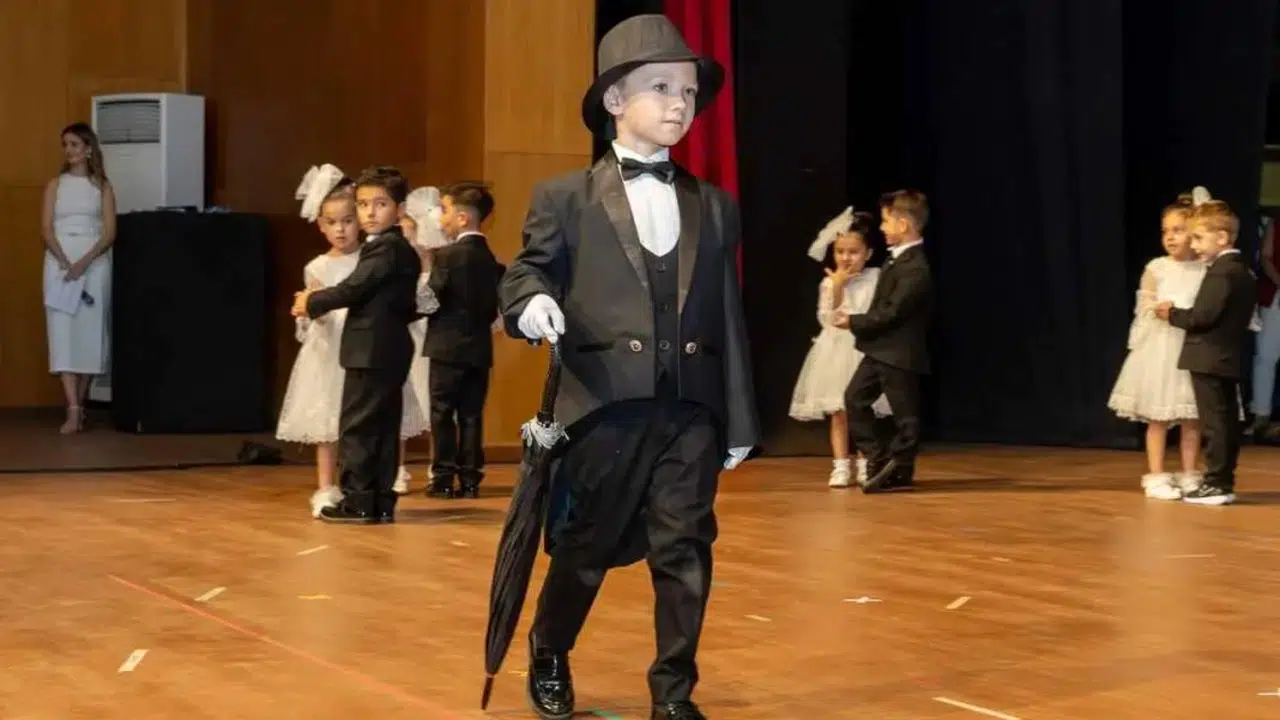 Kırmızı-beyaz kıyafetleriyle sahneye çıkan minikler, salonda bayram coşkusunu doruğa taşıdı.