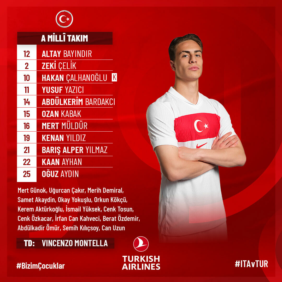 Türkiye’nin ilk 11’i ise Altay Bayındır, Zeki Çelik, Abdülkerim Bardakcı, Ozan Kabak, Mert Müldür, Hakan Çalhanoğlu, Kaan Ayhan, Oğuz Aydın, Yusuf Yazıcı, Barış Alper Yılmaz ve Kenan Yıldız