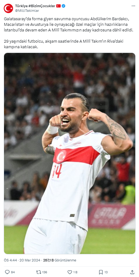 Galatasaray'ın defans oyuncusu Abdülkerim Bardakcı, A Milli Futbol Takımı'nın Macaristan ve Avusturya ile oynayacağı maçlar için aday kadroya dahil edildi.
