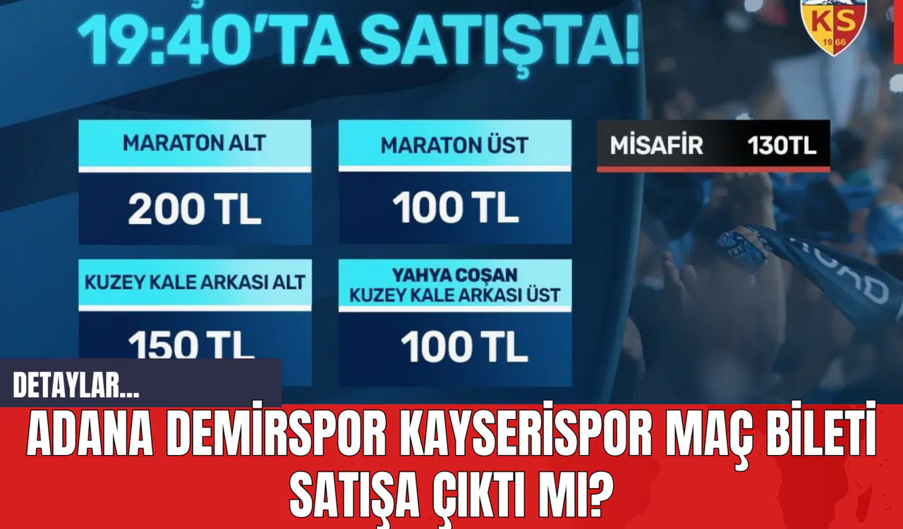 Mavi-lacivertli kulüpten yapılan açıklamaya göre, 13 Nisan Cumartesi günü Yeni Adana Stadyumu'nda gerçekleşecek olan Kayserispor maçının biletleri satışa sunuldu. Ayrıca, sadece gişeden yapılacak alımlarda kadınlar, öğrenciler ve engelliler için biletlerde %50 indirim uygulanacak.