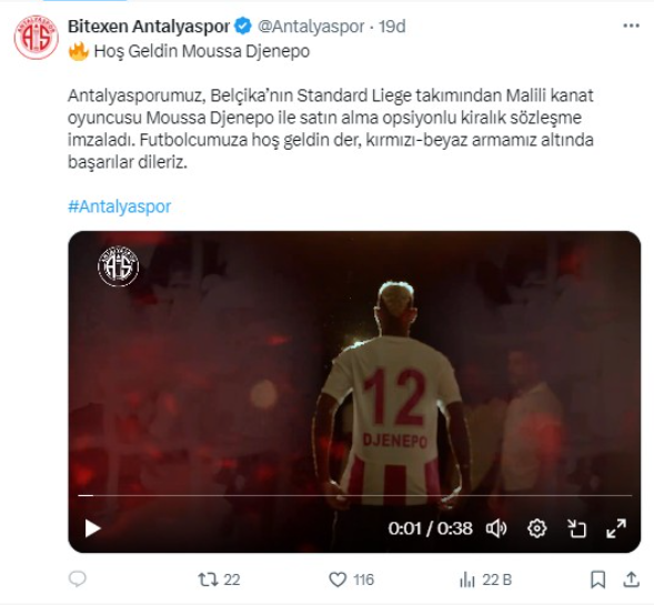 Antalyaspor'un resmi sosyal medya hesabından yapılan paylaşımda, 'Antalyasporumuz, Belçika’nın Standard Liege takımından Malili kanat oyuncusu Moussa Djenepo ile satın alma opsiyonlu kiralık sözleşme imzaladı. Futbolcumuza hoş geldin der, kırmızı-beyaz armamız altında başarılar dileriz' ifadelerine yer verildi.