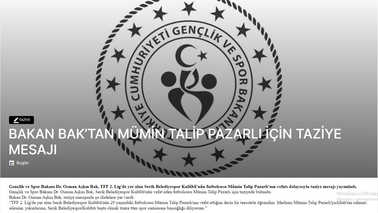 Gençlik ve Spor Bakanı Osman Aşkın Bak, TFF 2. Lig ekibi Serik Belediyespor'un futbolcusu Mümin Talip Pazarlı'nın vefatı üzerine bir taziye mesajı yayımladı. Bakan Bak, 'TFF 2. Lig'de yer alan Serik Belediyespor Kulübü'nün 29 yaşındaki futbolcusu Mümin Talip Pazarlı'nın vefat ettiğini derin bir teessürle öğrendim. Merhum Mümin Talip Pazarlı'ya Allah'tan rahmet; ailesine, yakınlarına, Serik Belediyespor Kulübü başta olmak üzere tüm spor camiasına başsağlığı diliyorum' ifadelerine yer verdi.