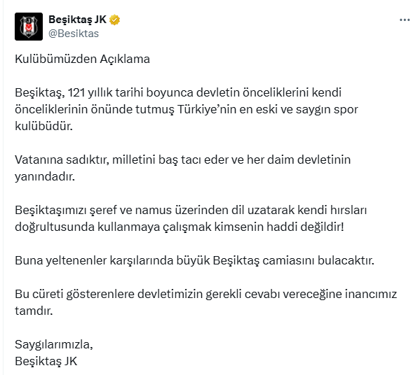 “Beşiktaş, 121 yıllık tarihi boyunca devletin önceliklerini kendi önceliklerinin önünde tutmuş Türkiye’nin en eski ve saygın spor kulübüdür. Vatanına sadıktır, milletini baş tacı eder ve her daim devletinin yanındadır. Beşiktaşımızı şeref ve namus üzerinden dil uzatarak kendi hırsları doğrultusunda kullanmaya çalışmak kimsenin haddi değildir! Buna yeltenenler karşılarında büyük Beşiktaş camiasını bulacaktır. Bu cüreti gösterenlere devletimizin gerekli cevabı vereceğine inancımız tamdır.”
