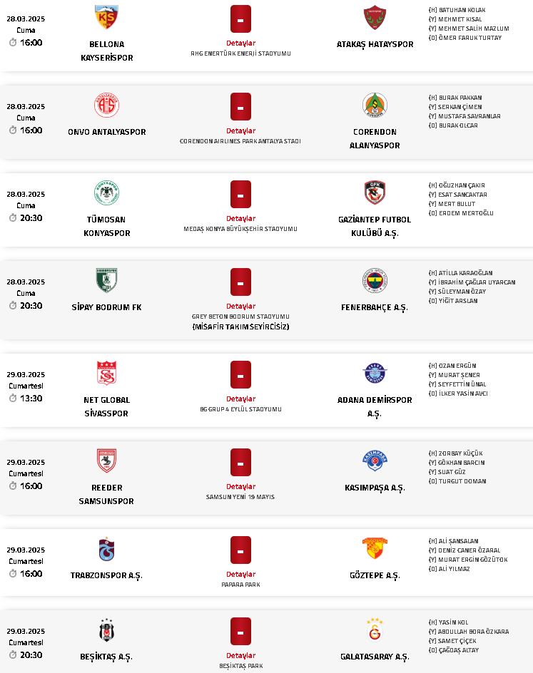 29 Mart Cumartesi günü oynanacak maçlardan; Sivasspor-Adana Demirspor mücadelesini Ozan Ergün yönetecek. Ergün'ün yardımcılığını Murat Şener ve Seyfettin Ünal yaparken karşılaşmanın 4'üncü hakemi İlker Yasin Avcı oldu. Maçın başlama saati 13.00.