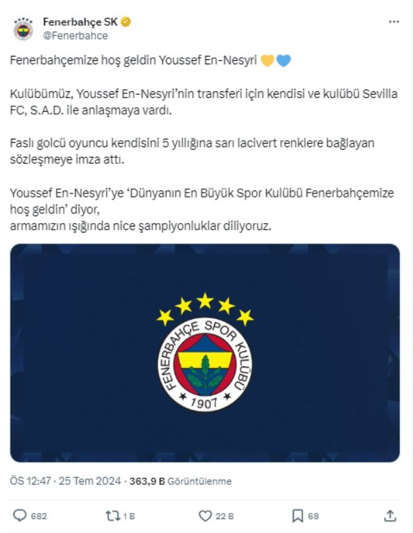 Fenerbahçe'nin Kamuyu Aydınlatma Platformu'na (KAP) yaptığı açıklamada, 'Profesyonel futbolcu Youssef En-Nesyri'nin transferi konusunda kulübü ve kendisi ile anlaşmaya varılmıştır. Sevilla Football Club, S.A.D. kulübüne toplam transfer bedeli olan 19.500.000 Avro, 4 yıl içerisinde 8 taksitle ödenecektir' denildi.