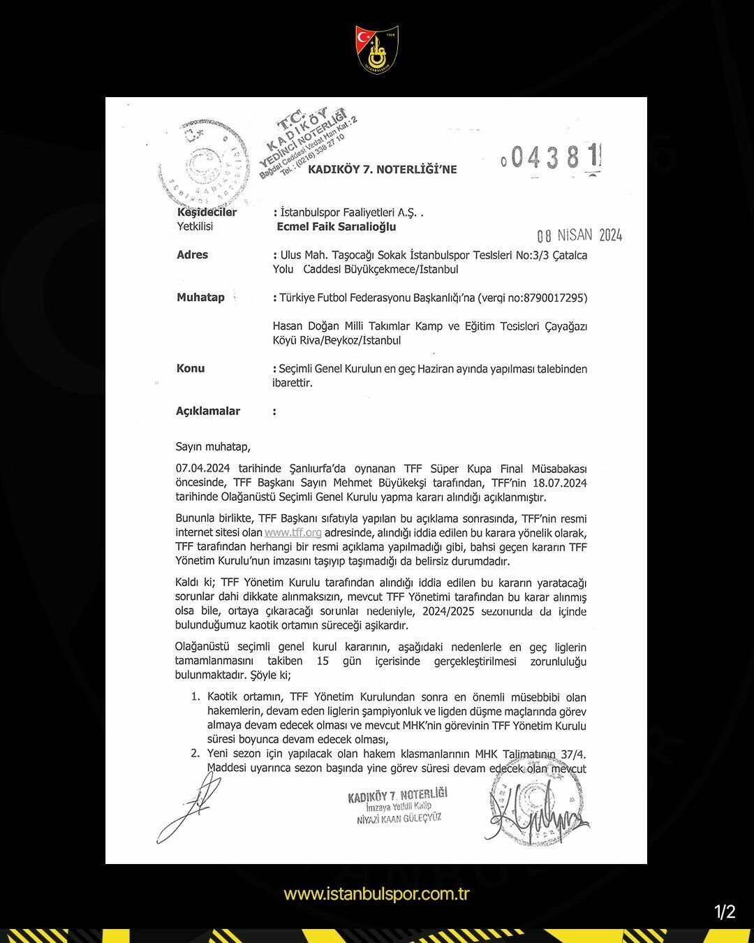 "İstanbulspor Faal. A.Ş. olarak, 08.04.2024 tarihi itibarıyla TFF'yi olağanüstü genel kurula davet etmiş durumdayız. TFF Başkanı Mehmet Büyükekşi tarafından 18.07.2024 tarihinde olağanüstü seçimli genel kurul yapılacağına dair açıklama yapılmış olmasına rağmen, bu açıklamayı destekleyen herhangi bir resmi belge ya da karar kamuoyuna sunulmamıştır.