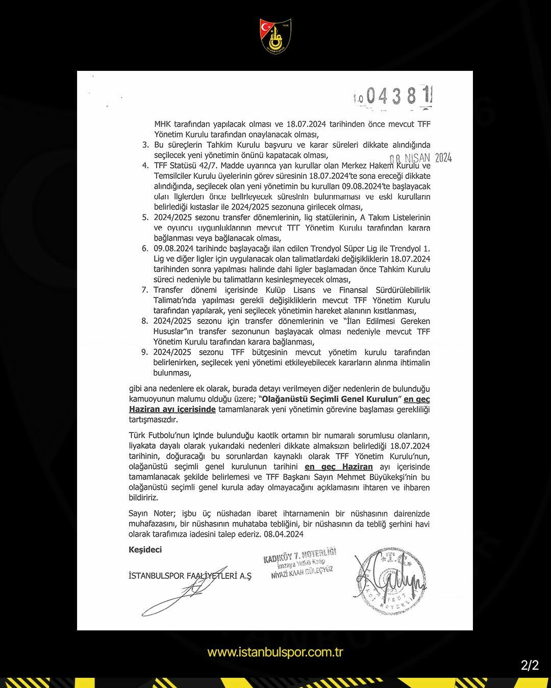 İstanbulspor'un yaptığı paylaşımda, Avrupa Şampiyonası'nda Mehmet Büyükekşi liderliğindeki Yönetim Kurulu'ndan oluşacak ilk 11'e başarılar dileyen bir mesaj paylaşıldı. İhtarnameyle ilgili yapılan açıklamada ise şu ifadeler kullanıldı: