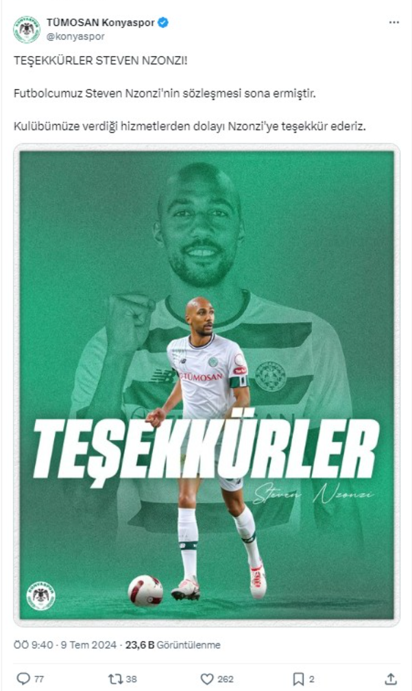 Konyaspor, 2023-2024 sezonunda transfer ettiği ve sözleşmesi sona eren Fransız orta saha oyuncusu Steven Nzonzi'ye veda etti. Yeşil-beyazlı kulüp, Nzonzi'nin takımdan ayrılmasının ardından resmi açıklama yaparak teşekkürlerini iletti.