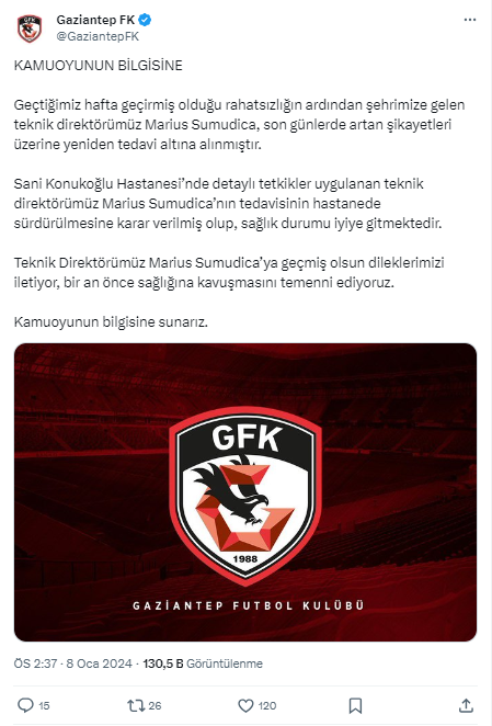 'Geçtiğimiz hafta geçirmiş olduğu rahatsızlığın ardından şehrimize gelen teknik direktörümüz Marius Sumudica, son günlerde artan şikayetleri üzerine yeniden tedavi altına alınmıştır. Sani Konukoğlu Hastanesi’nde detaylı tetkikler uygulanan teknik direktörümüz Marius Sumudica’nın tedavisinin hastanede sürdürülmesine karar verilmiş olup, sağlık durumu iyiye gitmektedir.