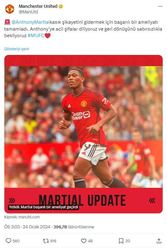 Martial'in kasık sorunları nedeniyle ameliyat kararı alındığı ve bu süreçte oyuncunun takımından uzak kalacağı bildirildi. Manchester United taraftarları ve futbol camiası, genç yetenek Martial'e en kısa sürede sağlığına kavuşması ve sahalara dönmesi için geçmiş olsun dileklerini iletiyor.