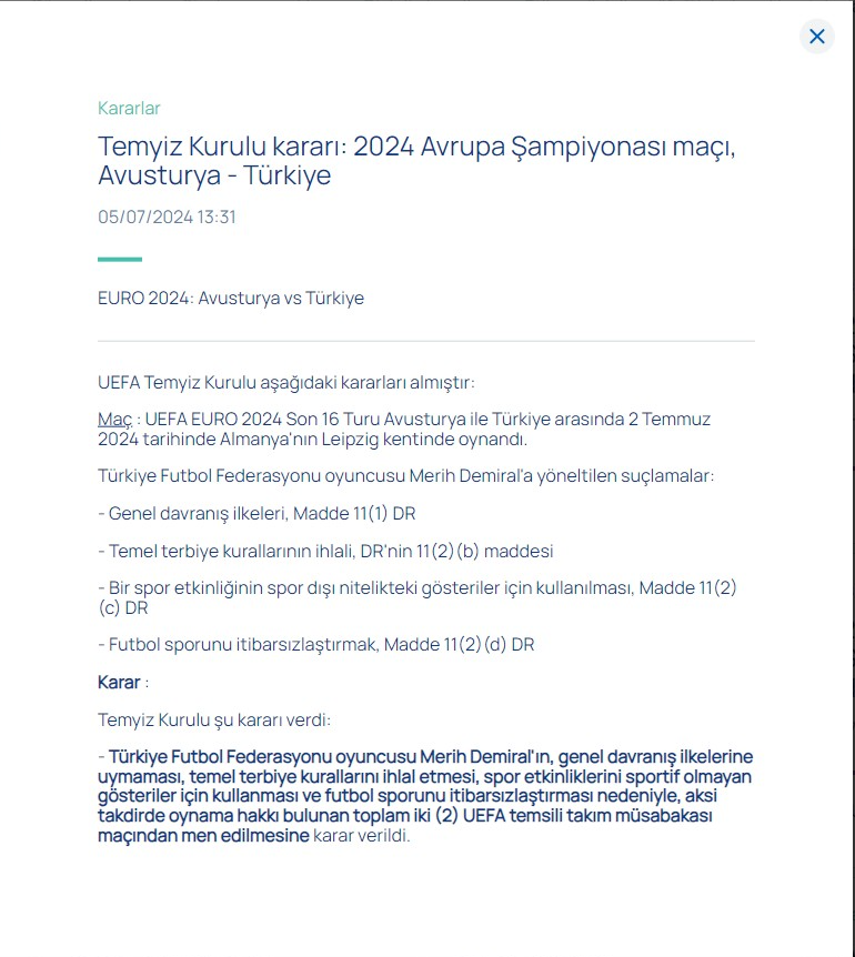 UEFA'dan yapılan açıklamada, Demiral'ın 'genel davranış ilkelerine uymadığı, temel nezaket kurallarını ihlal ettiği, spor etkinliklerini sportif olmayan nitelikteki gösteriler için kullandığı ve futbol sporunun itibarını zedelediği' gerekçesiyle, toplam iki UEFA milli takım müsabakasından men edildiği belirtildi. Bu karar, Türkiye Milli Takımı'nın önümüzdeki iki UEFA maçında Demiral'ın forma giyemeyeceği anlamına geliyor.