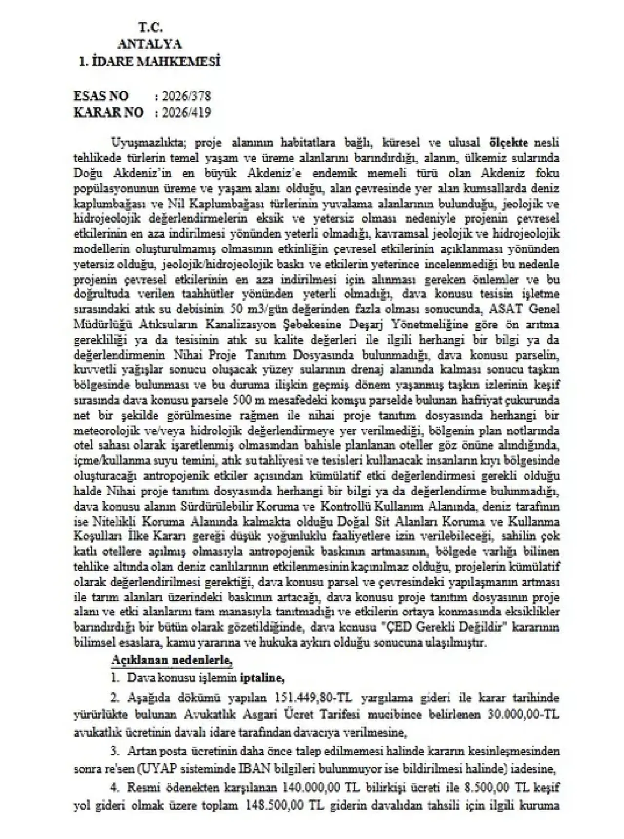 Tarım alanları üzerindeki yapılaşma baskısına da vurgu yapan Antalya 1. İdare Mahkemesi, bilimsel esaslara ve kamu yararına aykırı bulduğu "ÇED Gerekli Değildir" kararını 27 Mart 2026 tarihinde oybirliği ile iptal etti. Mahkeme kararında, "'ÇED Gerekli Değildir' kararının bilimsel esaslara, kamu yararına ve hukuka aykırı olduğu sonucuna ulaşılmıştır" ifadesi yer aldı.