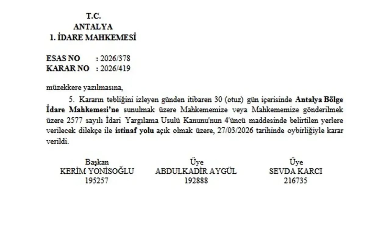 Kararın tebliğinden itibaren 30 gün içinde Antalya Bölge İdare Mahkemesi nezdinde istinaf yolunun açık olduğu öğrenildi.