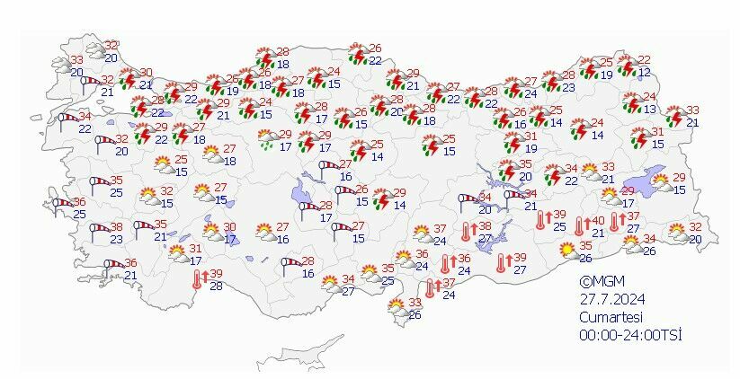 Türkiye genelinde hava durumu parçalı yer yer çok bulutlu olarak değerlendiriliyor. Marmara'nın doğusu, İç Anadolu'nun kuzeydoğusu, Karadeniz, Doğu Anadolu'nun kuzeyi, Ankara çevreleri, Mersin'in doğusu, Adana'nın güney ve batısı ile Hatay'ın kıyı kesimlerinde yerel sağanak ve gök gürültülü sağanak yağışlar bekleniyor. Yağışların Karadeniz kıyıları, Artvin, Kars ve Ardahan çevreleri ile Erzurum'un kuzey kesimlerinde yer yer kuvvetli olması öngörülüyor.