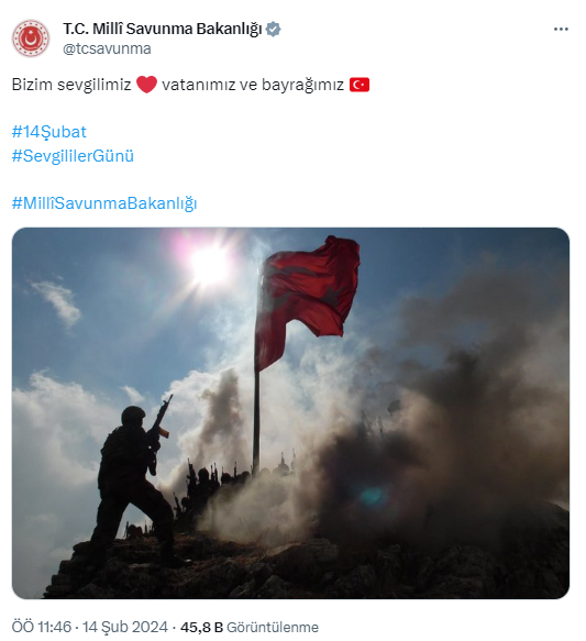 Millî Savunma Bakanlığı, 14 Şubat Sevgililer Günü dolayısıyla duygusal bir mesaj paylaştı. Bu özel günde, Türk milletine vurgu yapılarak, vatanın ve bayrağın en özel sevgili olduğu ifade edildi.