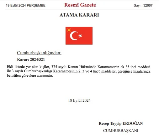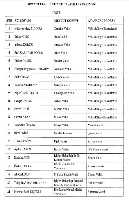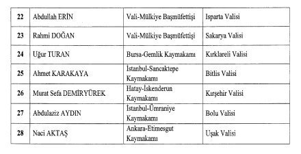 Cumhurbaşkanı Recep Tayyip Erdoğan'ın imzasıyla Resmi Gazete'de yayımlanan kararname ile Hüdayar Mete Buhara, Erkan Kılıç, Yılmaz Doruk, Erol Karaömeroğlu, Türker Öksüz, Hüseyin Engin Sarıibrahim, Zülkif Dağlı, Yaşar Karadeniz, Alper Tanrısever, Cengiz Ünsal, Enver Ünlü ve Cevdet Atay "vali-mülkiye başmüfettişliği" görevine getirildi.