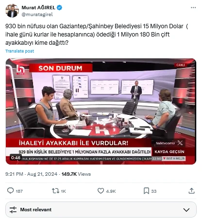 Halk TV'de yayınlanan "Kayda Geçsin" programında konuşan Murat Ağırel, Şahinbey Belediyesi’nin, 930 bin nüfusu olmasına rağmen, 1 milyon 180 bin çift ayakkabı dağıttığını ve bunun yaklaşık 15 milyon dolara mal olduğunu iddia etti. Ağırel, "Bu kadar büyük miktarda ayakkabı, Şahinbey’in nüfusunu aşıyor. Ayakkabılar kime dağıtıldı?" diye sordu.