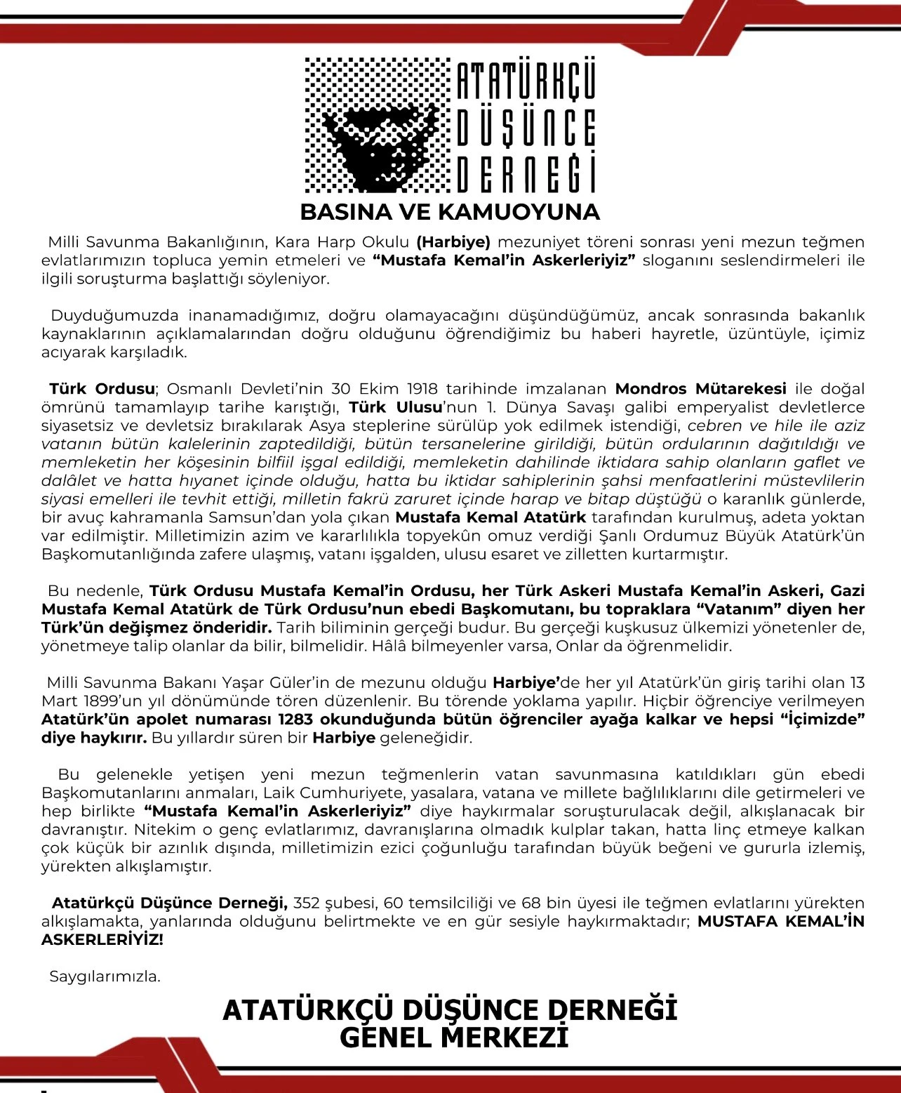 Atatürkçü Düşünce Derneği, Milli Savunma Bakanlığı'nın başlattığı soruşturmayla ilgili olarak bir basın açıklaması yayımladı.