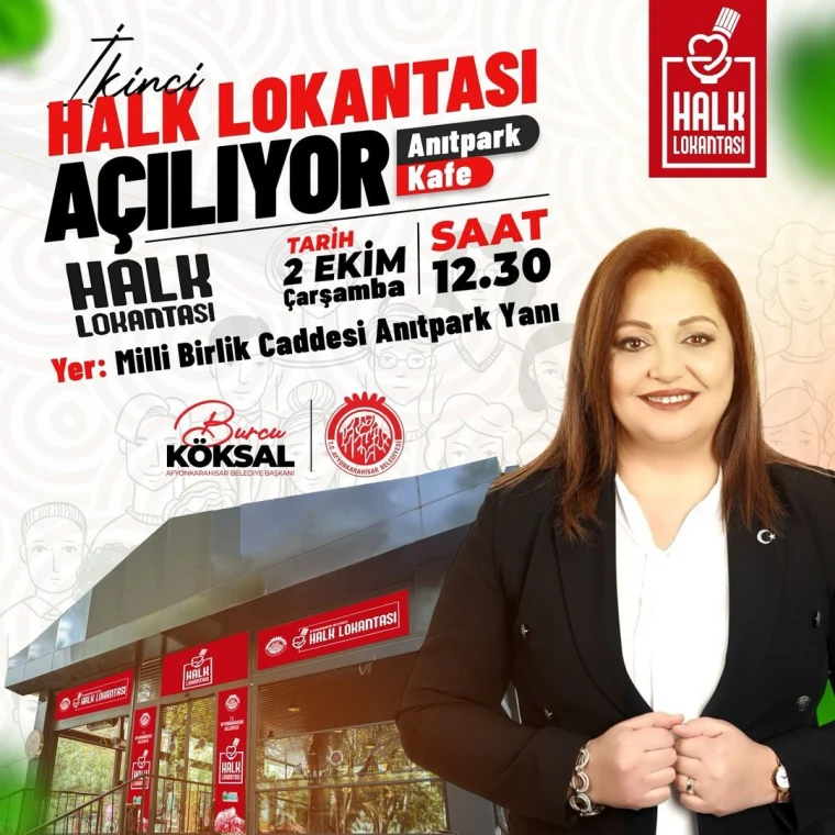 Afyonkarahisar Belediye Başkanı Burcu Köksal, resmi sosyal medya hesabından yaptığı açıklamada yeni halk lokantasının açılacağını duyurdu. Köksal, "Halkımızın bütçesine dost, lezzetli ve sağlıklı yemekler sunan İkinci Halk Lokantası kapılarını açıyor." ifadelerini kullanarak, bu yeni hizmetin halk için büyük bir kolaylık sağlayacağını belirtti.