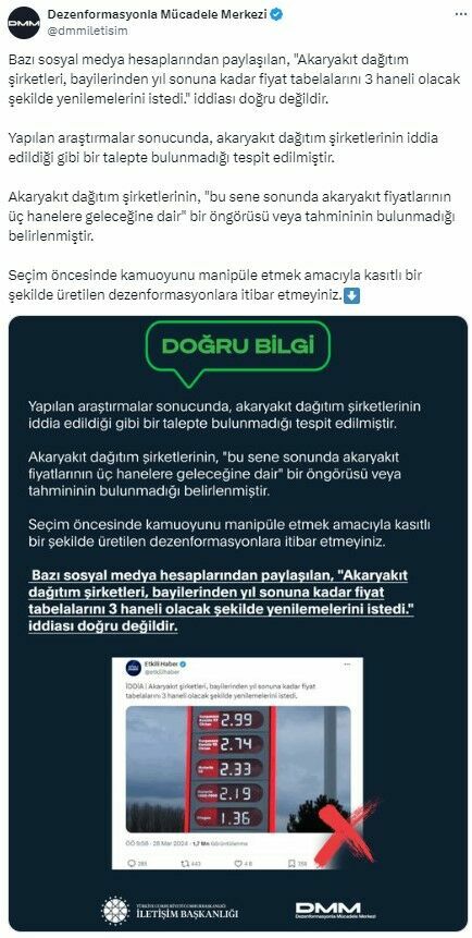 Dezenformasyonla Mücadele Merkezi'nin açıklamasında ayrıca, akaryakıt dağıtım şirketlerinin gelecek dönemde fiyatların üç haneli rakamlara çıkacağı yönünde bir öngörüsünün bulunmadığına dikkat çekildi. Bu tür manipülatif bilgilerin seçim öncesi kamuoyunu yanıltma amacı güttüğü ve böyle bilgilere itibar edilmemesi gerektiği vurgulandı.