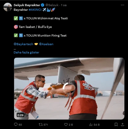 Testlerin detayları ve sonuçları Baykar Yönetim Kurulu Başkanı Selçuk Bayraktar, TOLUN mühimmatının test görüntülerini sosyal medya hesabında paylaştı. Bayraktar, paylaşımında “TOLUN mühimmat atış testi tam isabet” notunu düştü. Testin başarılı geçmesi, milli savunma sanayisinde önemli bir kilometre taşı olarak kabul ediliyor.