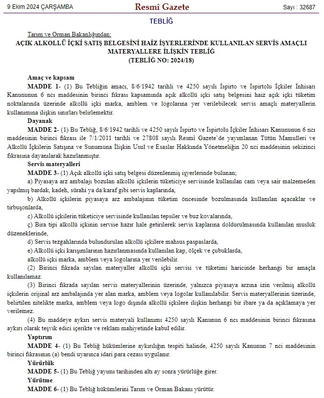 Tebliğ kapsamında, açık alkollü içki satış belgesine sahip iş yerlerinde kullanılan servis amaçlı materyallerin, alkollü içki marka, amblem ve logolarına yer verebilmesi için bazı sınırlamalar getirildi. Buna göre, piyasaya arz ambalajı bozulan alkollü içkilerin tüketiciye servis edilmesinde kullanılan cam veya diğer malzemelerden yapılmış bardak, kadeh, sürahi, karaf gibi kaplar, açacaklar, tirbuşonlar, tepsiler, buz kovaları, bira muslukları, paspaslar, kaplar, ölçekler ve çubuklar gibi servis materyallerinde sadece orijinal ambalajda yer alan marka, amblem veya logolar kullanılabilecek.