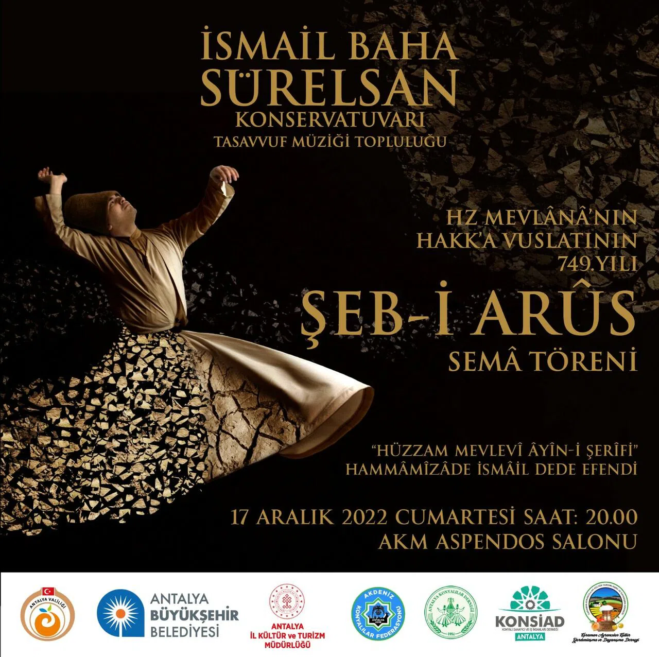 Mevlânâ Celâleddin-i Rûmî Hakk’a vuslatının 749’ncu yıldönümünde Antalya’da Semâ Töreni ile anılacak. Antalya Büyükşehir Belediyesi Kültür ve Sosyal İşler Daire Başkanlığı Antalya Valiliği, İl Kültür ve Turizm Müdürlüğü, Akdeniz Konyalılar Federasyonu, Antalya Konyalılar Derneği, Konyalı Sanayici ve İş İnsanları Derneği Antalya Şubesi, Karaman Ayrancılar Kültür Yardımlaşma ve Dayanışma Derneği işbirliğiyle düzenlenecek Sema Töreni 17 Aralık Cumartesi günü saat 20.00’de AKM Aspendos Salonu’nda gerçekleştirilecek. Mevlânâ’yı anma etkinliğinde her yıl olduğu gibi bu yıl da Antalya Büyükşehir Belediyesi İsmail Baha Sürelsan Konservatuvarı Tasavvuf Müziği Topluluğu sahne alacak. Haber Merkezi