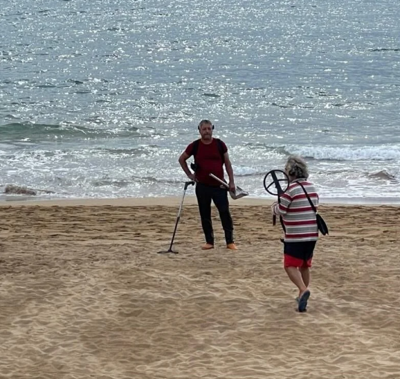 Turistlerin kaybettiği metal eşya, altın bilezik, kolye, yüzük, gümüş ve madeni paraları dedektörle tespit etmeye çalışan define avcıları, sahili baştan başa dolaştı. Şimdiye kadar sadece 1 euro bulduğunu söyleyen define avcılarından biri, “Her plajda arama yapıyoruz.