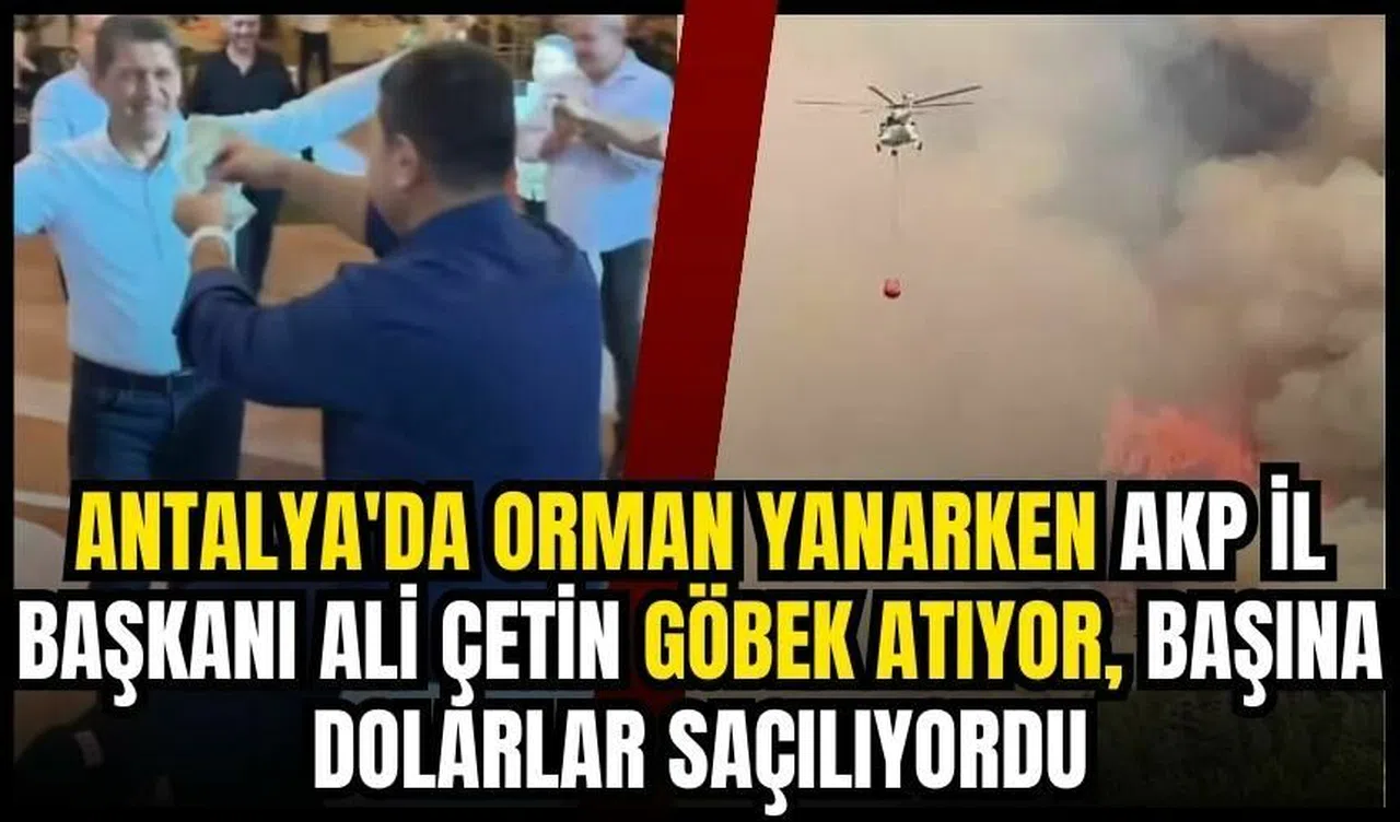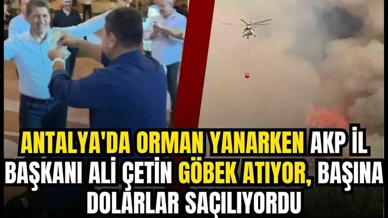 AKP İl Başkanı Ali Çetin, dün Alanya’da evlerin yandığı, çok sayıda evin boşaltıldığı saatlerde partisinin Aksu Meclis Üyesi ve Aksu Belediye Başkan Yardımcısı Emin Bal’ın oğlunun düğününde göbek atıp oynadı. Bal’ın, il başkanının üzerine dolar saçtığı anlar kameralara yansıdı. O anlar sosyal medyada büyük tepki topladı.