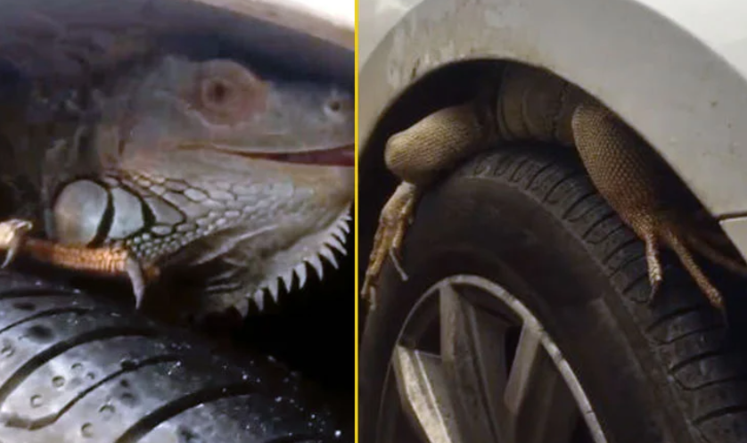 Kuyruğundan ve ayaklarından çekilen iguana uzun süre bulunduğu yerden çıkarılamamıştı. O anları araç sahibinin arkadaşı cep telefonu kamerasıyla görüntülemişti.