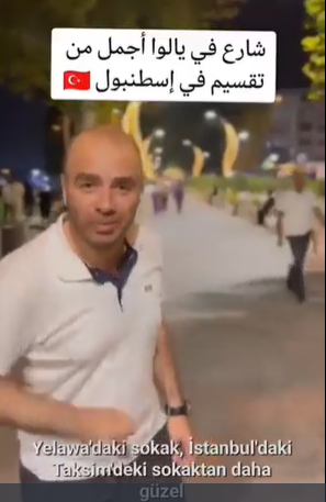 “Yalova’daki sokak, İstanbul’daki Taksim’deki sokaktan daha güzel. Tabi bu cadde gördüğünüz sahildeki cadde. Sokak çok güzel bir ışıkla karakterize edilir. Ağaçlar ve yeşilliklerle dolu. Ve ayrıca doğrudan sahilde şehrin sahilinde. Birçok restoran ve kafe var. Bunların arasında Türk restoranları ve kafeleri de var. Bir Yemen restoranı ve bir de Irak restoranı var. Bu vesileyle Yolava’daki Arap toplumuna selamlarını iletmek istiyorum”