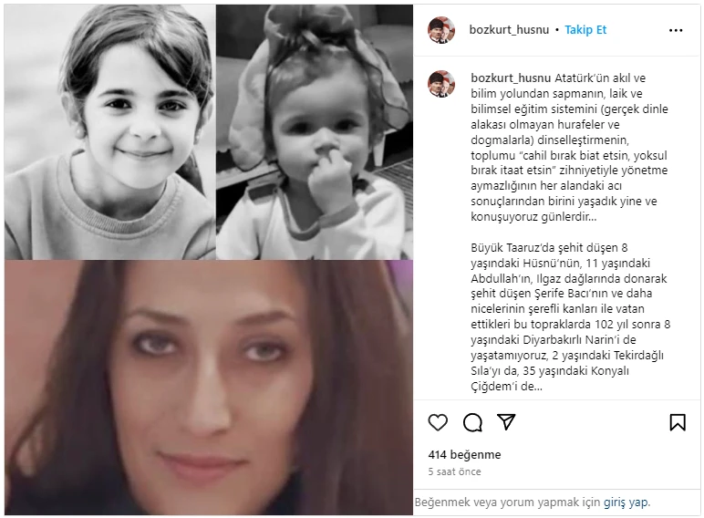 Bozkurt, ‘’Atatürk’ün akıl ve bilim yolundan sapmanın, laik ve bilimsel eğitim sistemini (gerçek dinle alakası olmayan hurafeler ve dogmalarla) dinselleştirmenin, toplumu “cahil bırak biat etsin, yoksul bırak itaat etsin” zihniyetiyle yönetme aymazlığının her alandaki acı sonuçlarından birini yaşadık yine ve konuşuyoruz günlerdir…