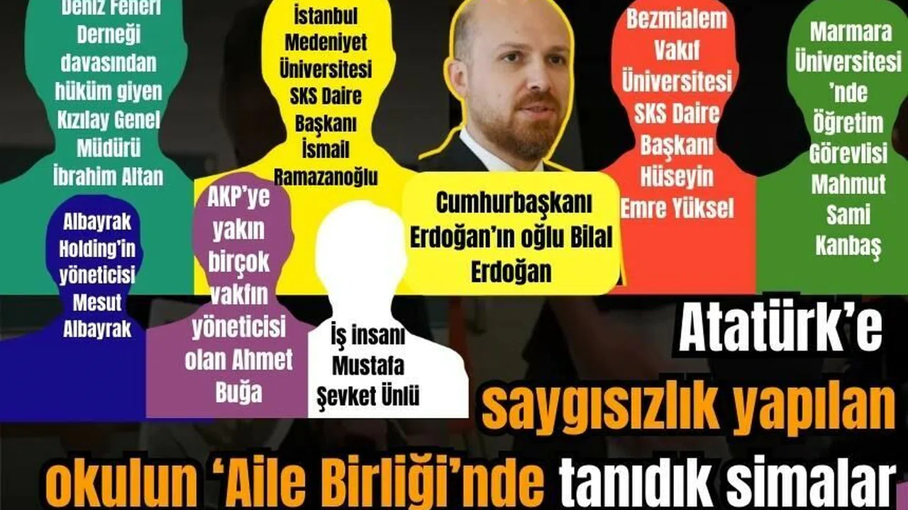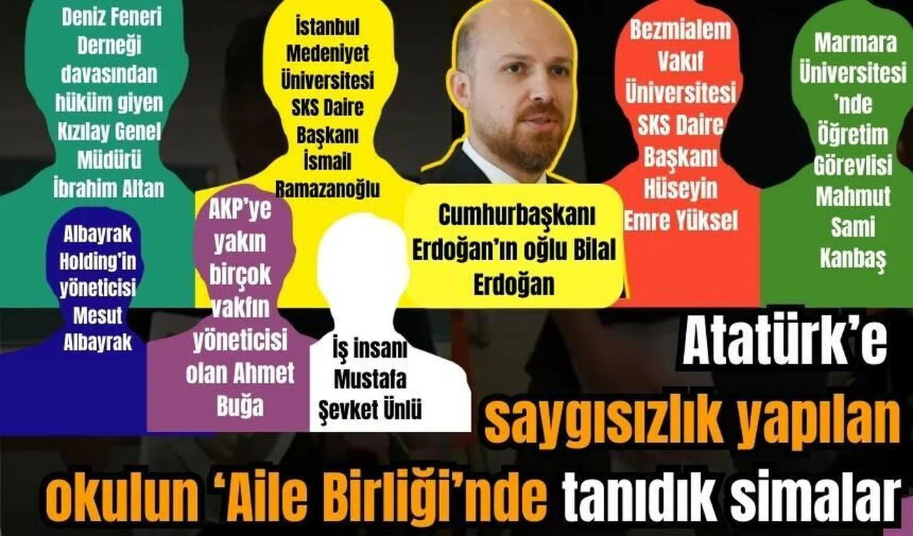 İstanbul Marmara İmam Hatip Lisesi’nde çekildiği konuşulan “Atatürk’e saygısızlık görüntüleri” büyük tepki toplarken çaprıcı bir bilgi daha elde edildi. Lisenin ‘Okul Aile Birliği’nde ise Cumhurbaşkanı Erdoğan'ın oğlu Bilal Erdoğan’dan Kızılay Genel Müdürü İbrahim Altan’a kadar birçok ‘tanıdık’ isim yer aldığı öğrenildi. İşte diğer isimler....