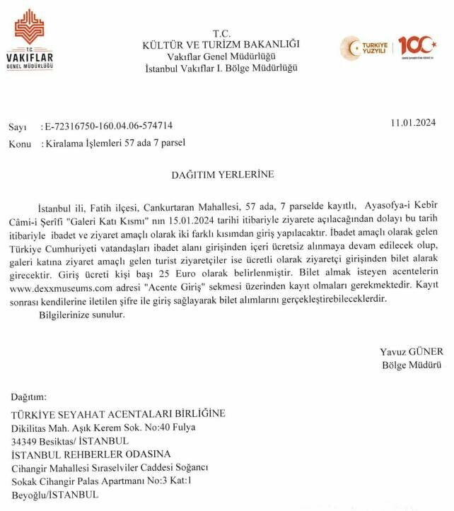 İstanbul ili, Fatih ilçesi, Cankurtaran Mahallesi'nde bulunan ve 57 ada, 7 parselde kayıtlı olan Ayasofya-i Kebîr Câmi-i Şerîfi'nin "Galeri Katı Kısmı"nın 15 Ocak 2024 tarihi itibariyle ziyarete açılması nedeniyle, bu tarihten itibaren ibadet ve ziyaret amaçlı olarak iki farklı giriş sistemi uygulanacaktır.