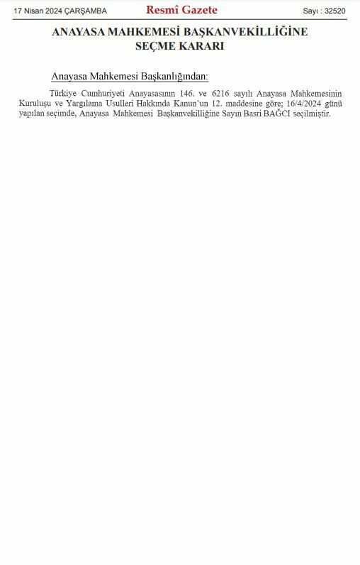 Anayasa Mahkemesi Başkanvekilliği'ne yapılan seçim sonucu Basri Bağcı'nın seçilmesine ilişkin karar, Resmi Gazete üzerinden yayımlandı. Bu karar, Anayasa Mahkemesi Kuruluşu ve Yargılama Usulleri Hakkında Kanun'un 12. maddesi uyarınca alındı ve 16 Nisan tarihinde gerçekleştirilen seçimde Basri Bağcı bu göreve seçildi.
