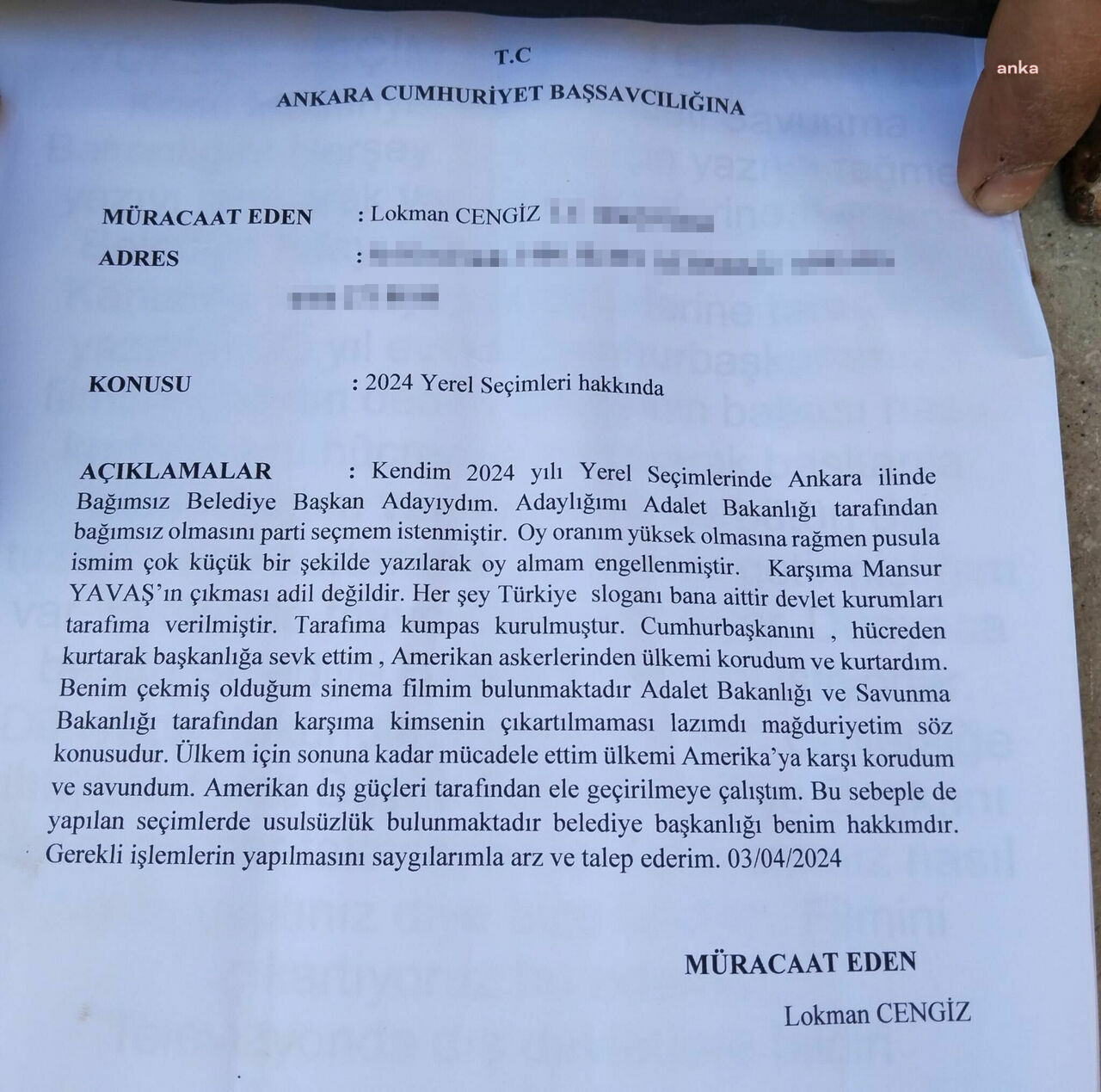 Ankara Büyükşehir Belediye Başkanlığı için bağımsız aday olan Lokman Cengiz, seçimlerde 224 oy alarak sonuçlardan memnun kalmadı. Kendi iddiasına göre, 'oy pusulasında isminin küçük harflerle yazıldığı için oy kaybettiğini' belirterek Yüksek Seçim Kurulu'na itirazda bulundu. Ayrıca, Ankara Cumhuriyet Başsavcılığına da suç duyurusunda bulundu.