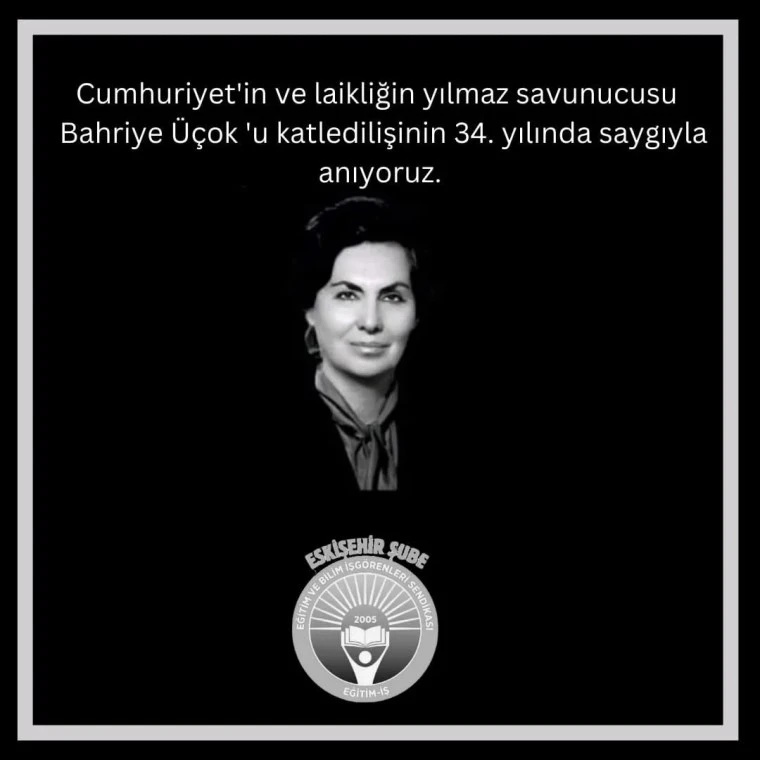 Bugün, Bahriye Üçok'un katledilişinin 34. yılı. Eskişehir Eğitim İş, sosyal medya üzerinden yaptığı paylaşım ile onu andı. Anma mesajında, "Laik, demokratik Türkiye Cumhuriyeti'nin savunucusu, Ankara Üniversitesi İlahiyat Fakültesi'nin ilk kadın akademisyeni Bahriye Üçok, Cumhuriyet ve aydınlanma düşmanları tarafından evine gönderilen bombalı paketle katledildi" ifadelerine yer verildi.
